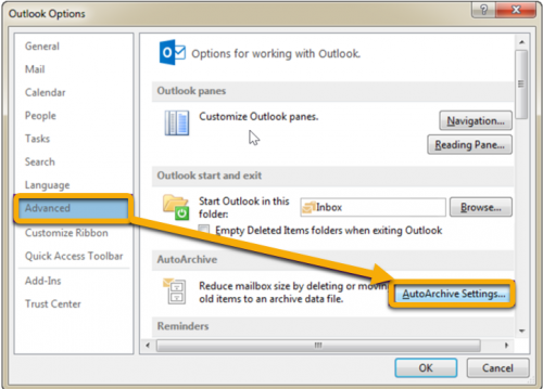 2. Click on the Advanced tab and go to AutoArchive Settings.