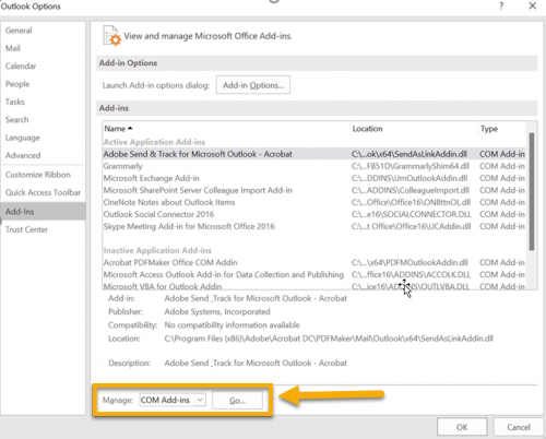 - Select Add–Ins. Under the Manage option, select COM Add-ins.