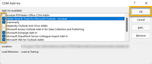 - Now, uncheck all the add-ins and click OK to disable them.